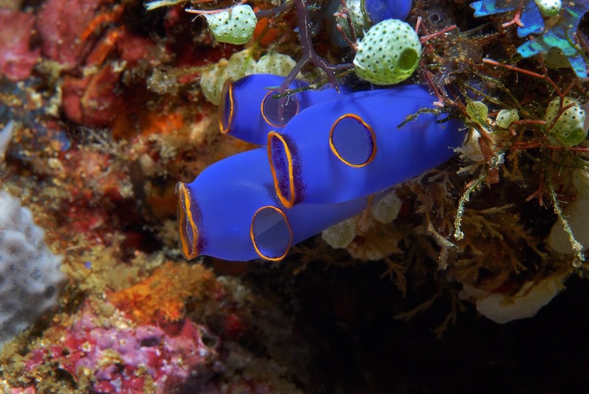 CW2C_2690_sm Blue Tunicates from the Philippines are filter feeders that draw water through an oral siphon and expel it through an atrial siphon California Diver — March 15, 2026
