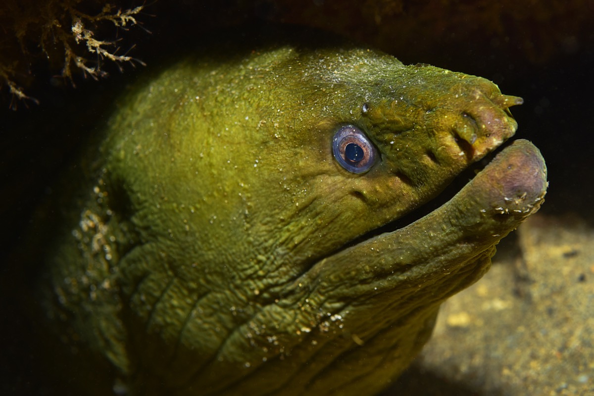 MS4C_3011_sm The Green Moray Eel’s skin is actually not green but a mustard brown color California Diver — January 14, 2026
